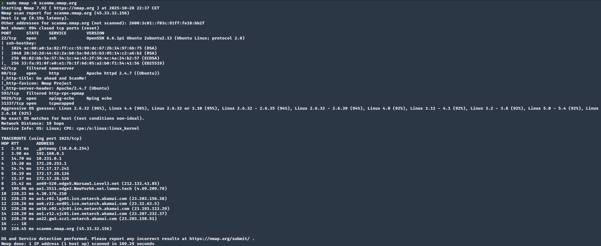sudo nmap -sV -O scanme.nmap.orgsudo nmap -A scanme.nmap.orgW praktyce, często łączymy te skany używając -sV -O lub opcji -A, która wykonuje analizę wersji, wykrywa system operacyjny, uruchamia skrypty NSE i trasa traceroute jednocześnie. To daje nam pełny obraz celu, choć trwa dłużej i jest bardziej „głośne” w sieci.